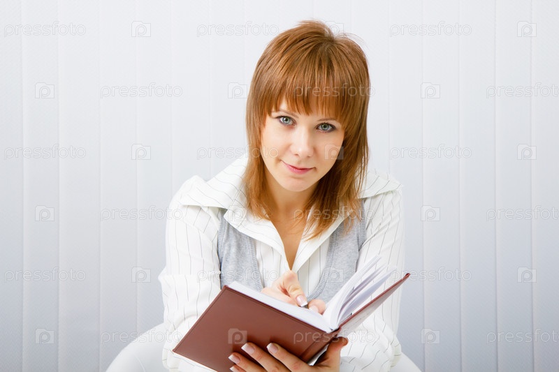 Молодая девушка с блокнотом, сидящая за столом
