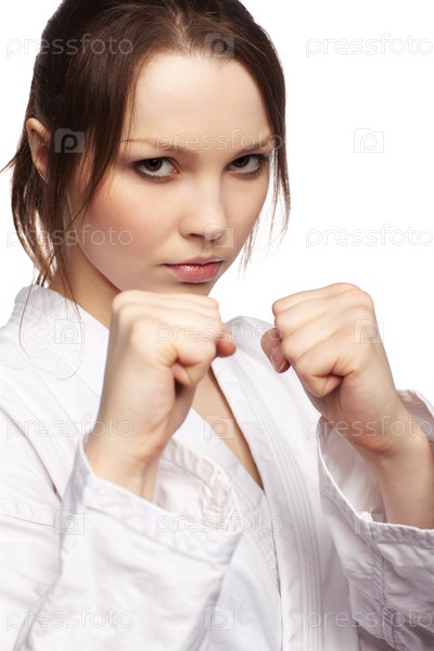 Портрет красивой девушки, занимающейся боевыми искусствами, на белом фоне