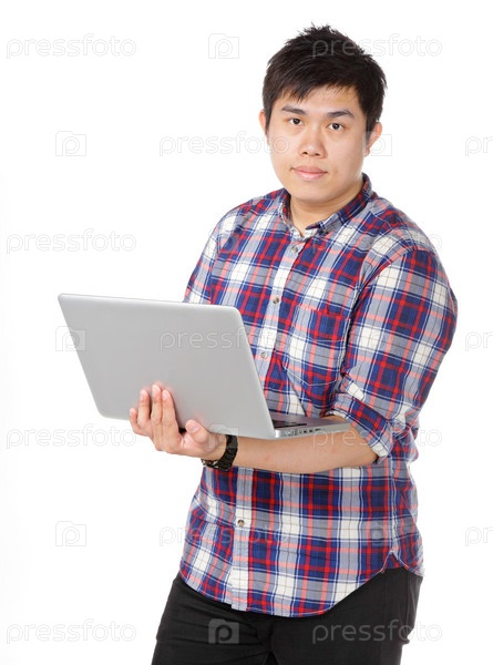 Азиатский мужчина держит ноутбук