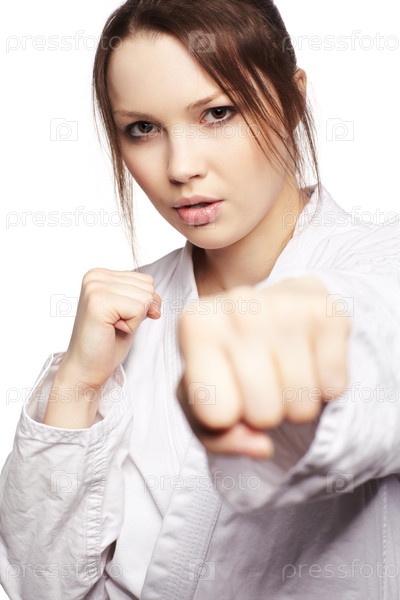 Портрет красивой девушки, занимающейся боевыми искусствами, на белом фоне