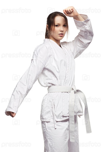 Портрет красивой девушки, занимающейся боевыми искусствами, на белом фоне