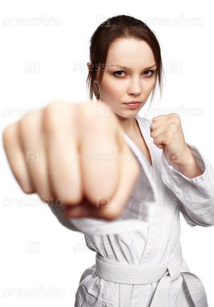 Портрет красивой девушки, занимающейся боевыми искусствами, на белом фоне