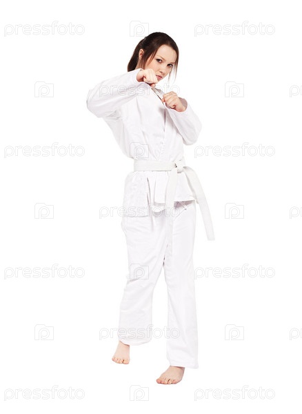Портрет красивой девушки, занимающейся боевыми искусствами, на белом фоне
