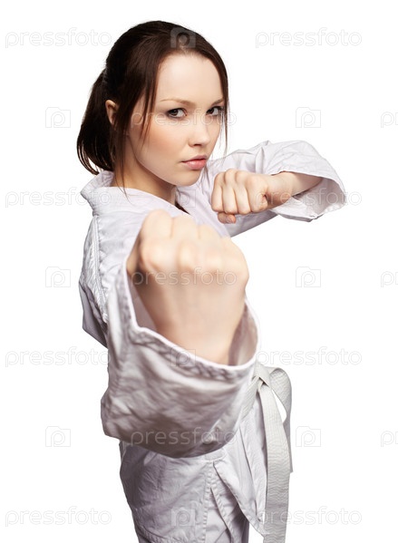 Портрет красивой девушки, занимающейся боевыми искусствами, на белом фоне