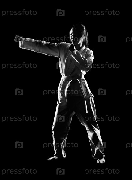 Силуэт красивой девушки, занимающейся боевыми искусствами, на черном фоне