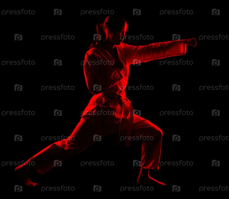 Красный силуэт красивой девушки, занимающейся боевыми искусствами, на черном фоне