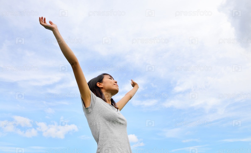 Азиатская женщина с поднятыми в воздух руками