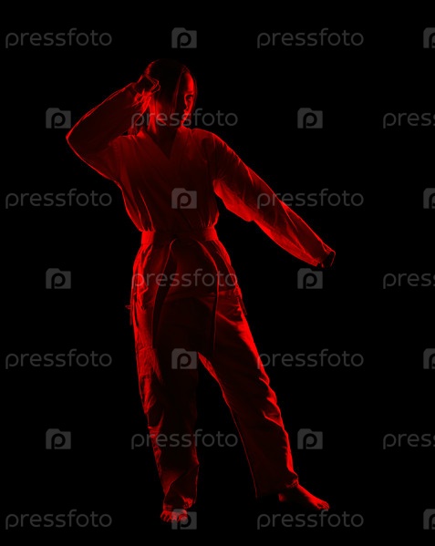 Красный силуэт красивой девушки, занимающейся боевыми искусствами, на черном фоне