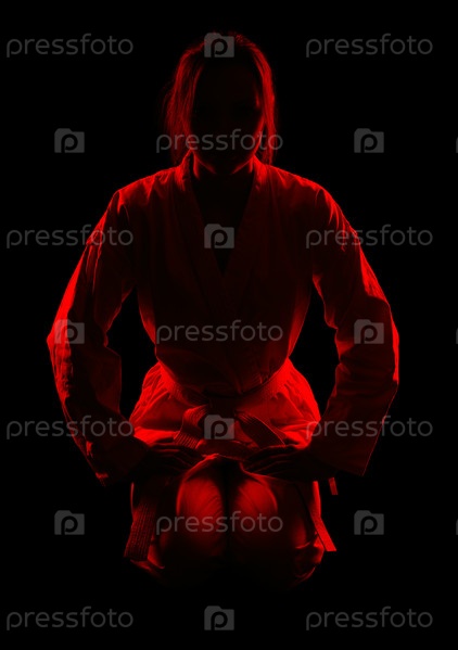 Красный силуэт красивой девушки, занимающейся боевыми искусствами, на черном фоне