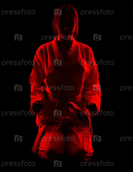 Красный силуэт красивой девушки, занимающейся боевыми искусствами, на черном фоне