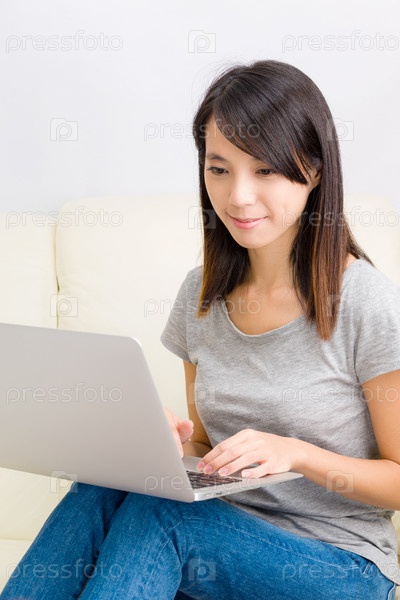 Азиатская женщина с ноутбуком сидит на диване