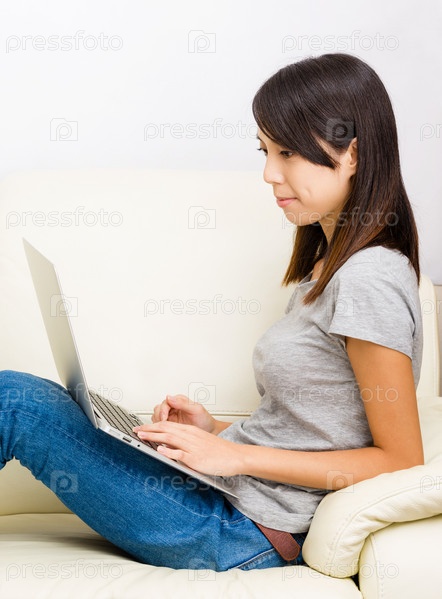 Азиатская женщина с ноутбуком сидит на диване