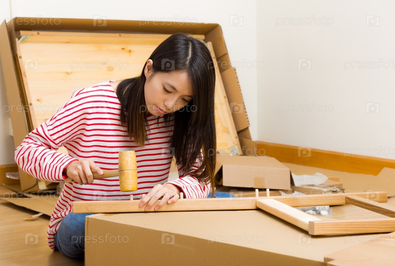 Азиатская женщина собирает мебель