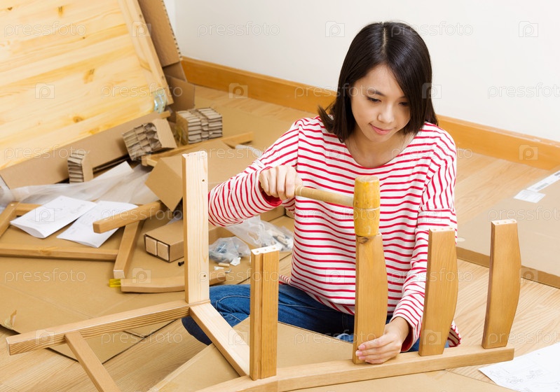 Азиатская женщина собирает мебель