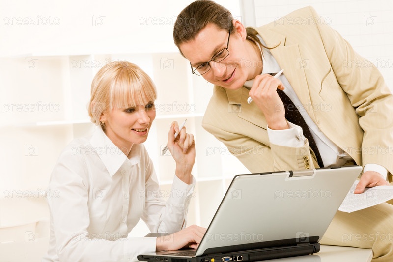 Портрет уверенных в себе партнеров, которые смотрят на дисплей ноутбука и вероятно обсуждают новый бизнес-проект