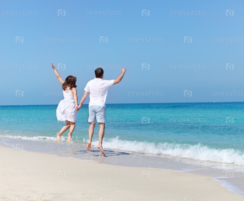 Пара прыгает на пляже