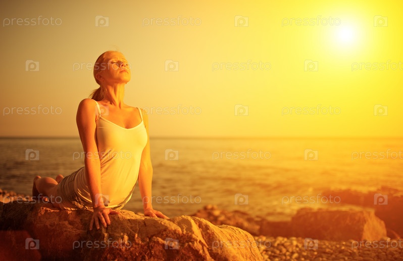 Женщина медитирует на пляже на закате