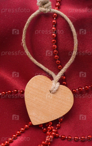 Деревянное сердце и красные бусы на атласной драпировке - Сувенир в день святого Валентина (Valentine's Day)