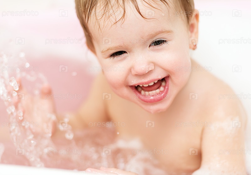 Счастливый ребенок купается в ванне