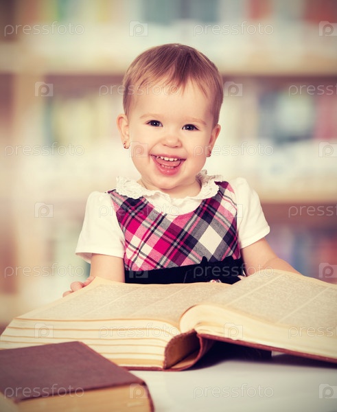 Счастливая девочка читает книгу в библиотеке