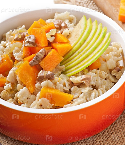 Овсяная каша с тыквой, яблоками, орехами и медом