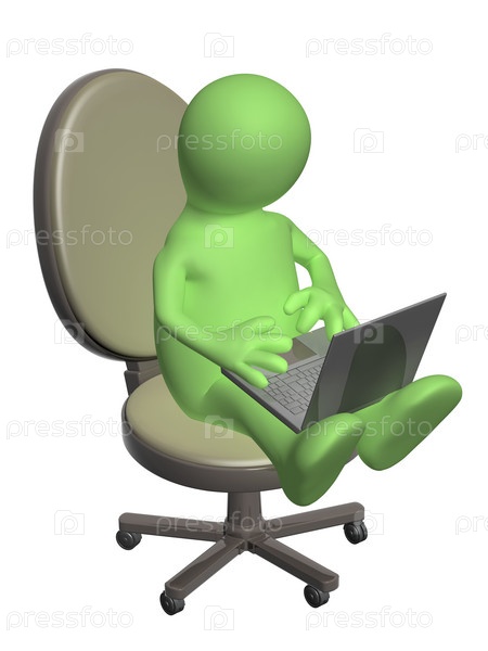 Трехмерная кукла сидит с ноутбуком