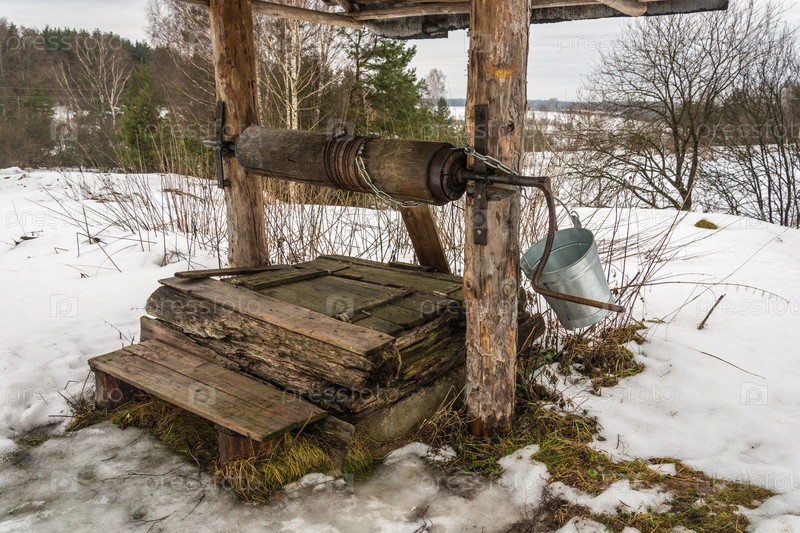 Старый деревянный колодец на краю деревни с металлическим ведром для подъема воды