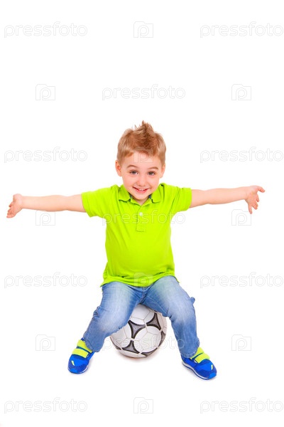 Маленький мальчик сидит на футбольном мяче