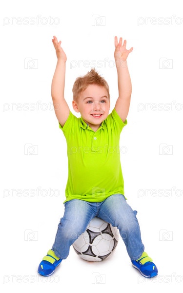 Маленький мальчик сидит на футбольном мяче