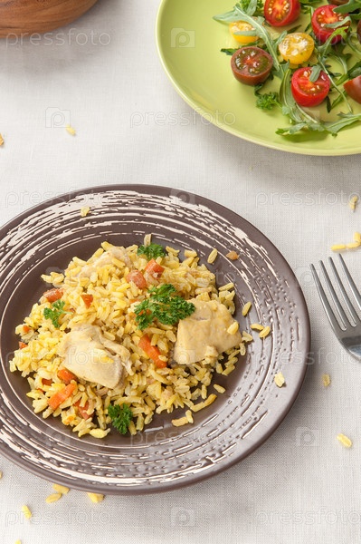 Плов с курицей и салат из овощей