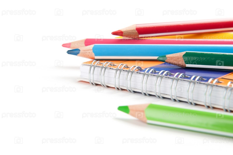 Карандаши и тетради на белом фоне