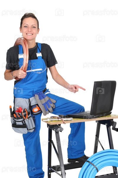 Сантехник с инструментами и ноутбуком