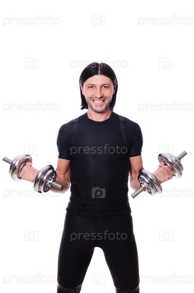 Мужчина с гантелями на белом