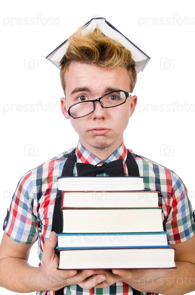 Смешной студент со стопкой книг