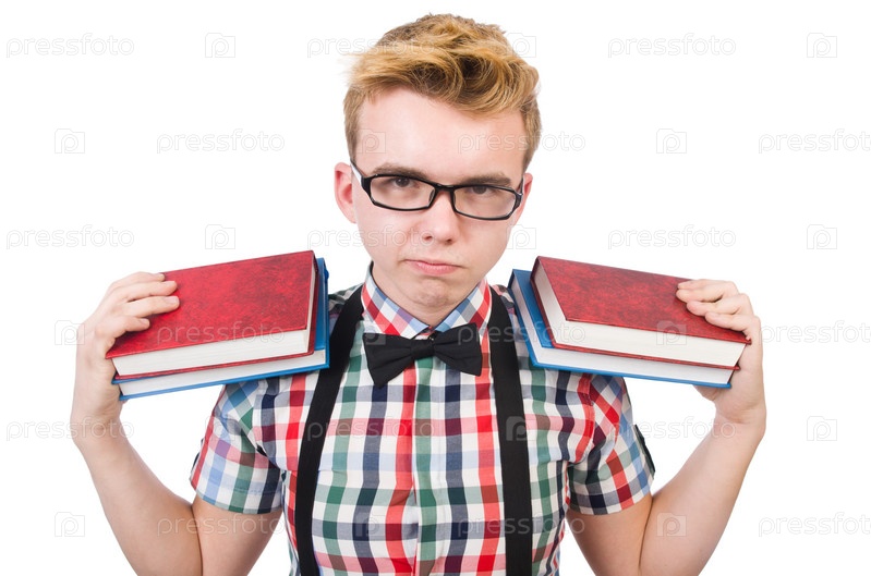 Смешной студент со стопкой книг