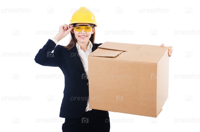 Бизнес-леди в каске с коробкой в руках