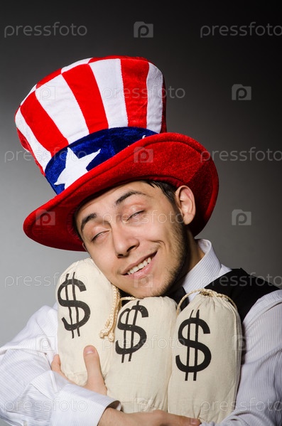 Забавный мужчина с мешками денег