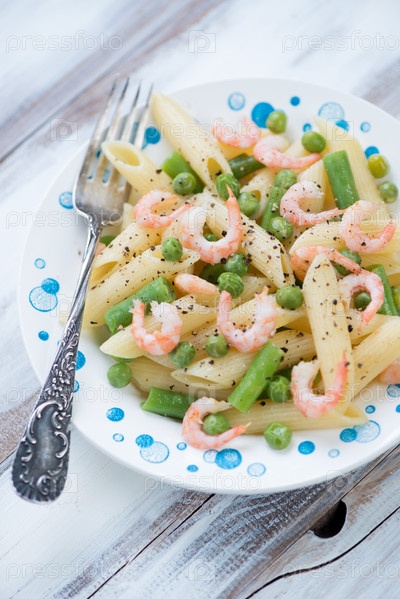Паста пенне с вареными креветками и овощами