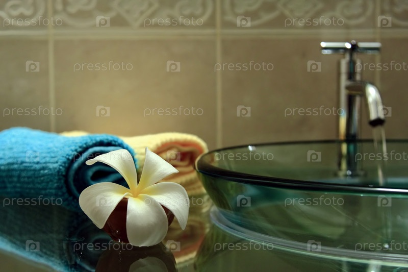 Пара полотенец и белый цветок, лежащие рядом со стеклянной раковиной