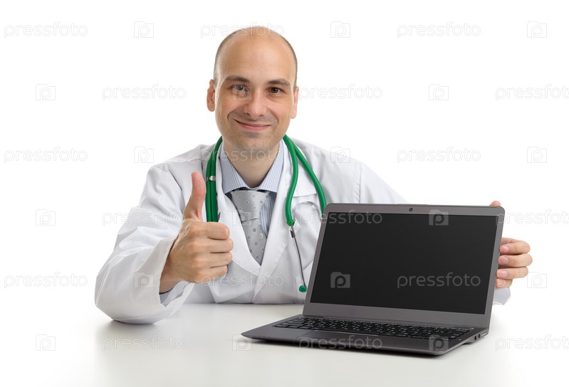 Счастливый доктор с жестом успеха и ноутбуком
