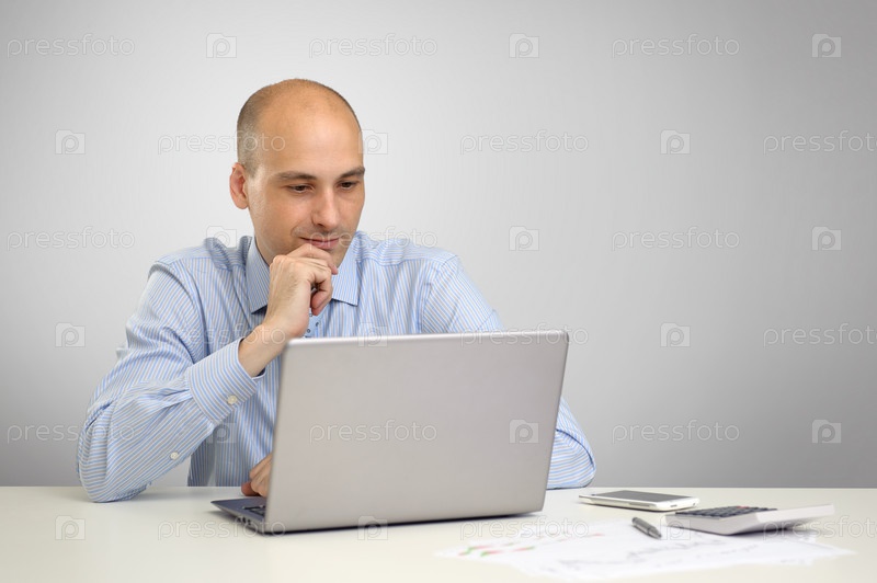 Задумчивый деловой человек, работающий на ноутбуке