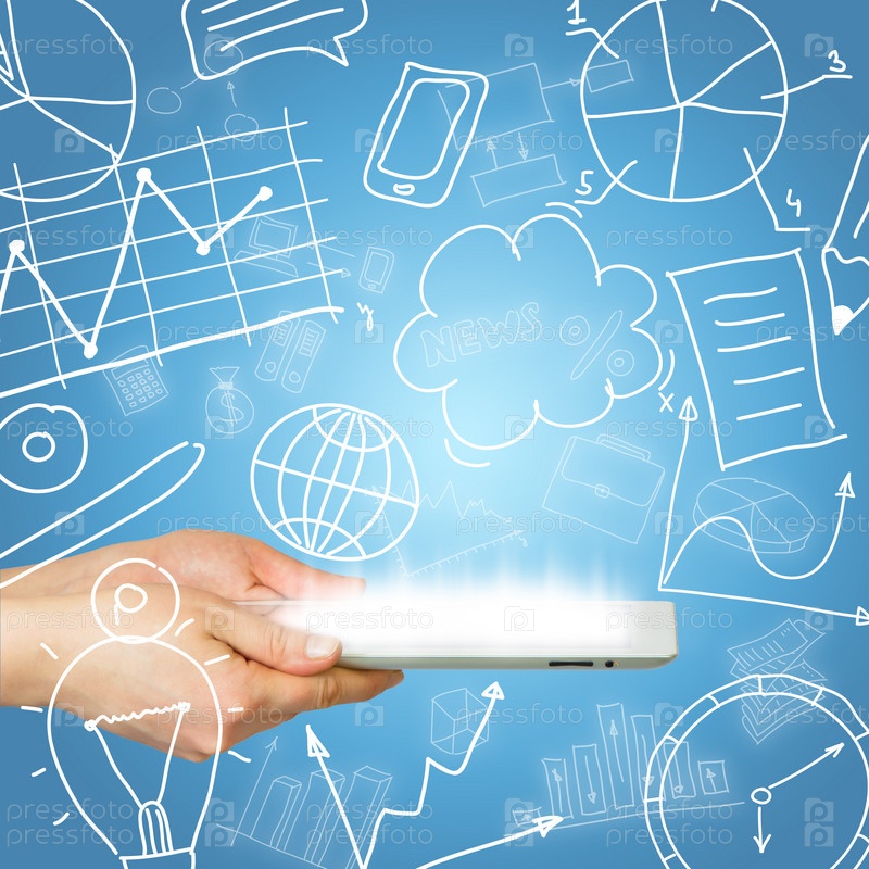 Планшет в руках на фоне иконок