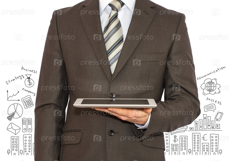 Человек с планшетом в руках на фоне иконок
