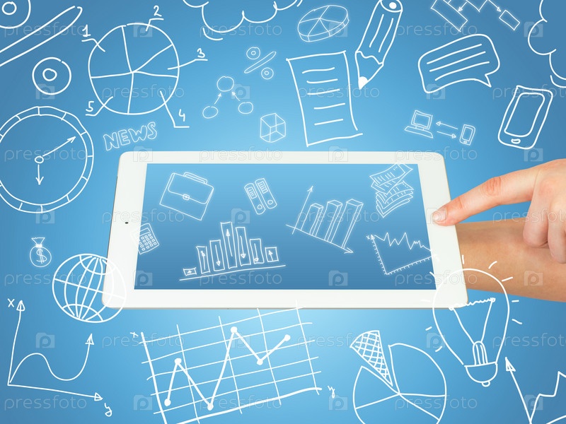 Планшет в руках на фоне иконок