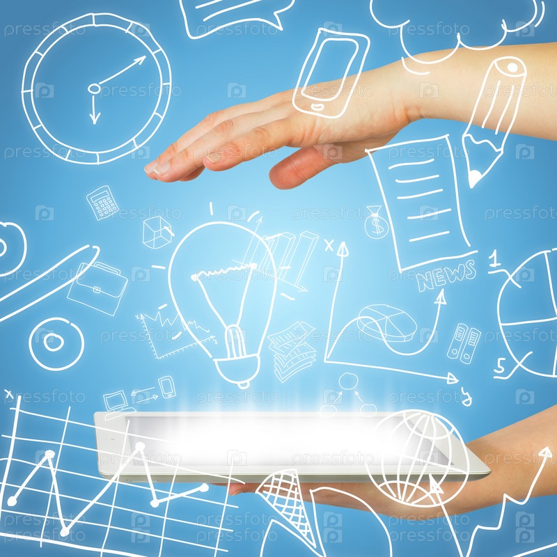 Планшет в руках и символы бизнеса