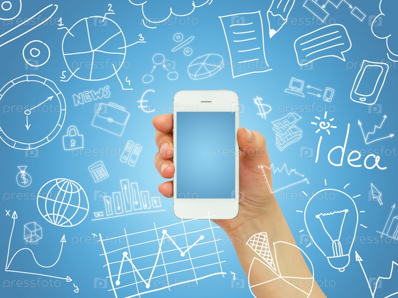 Смартфон в руке и символы бизнеса