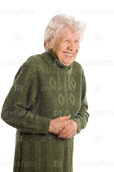 Улыбающаяся пожилая женщина в зеленом платье на белом фоне