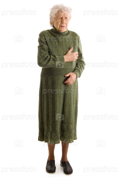 Пожилая женщина в зеленом платье, держащаяся за сердце