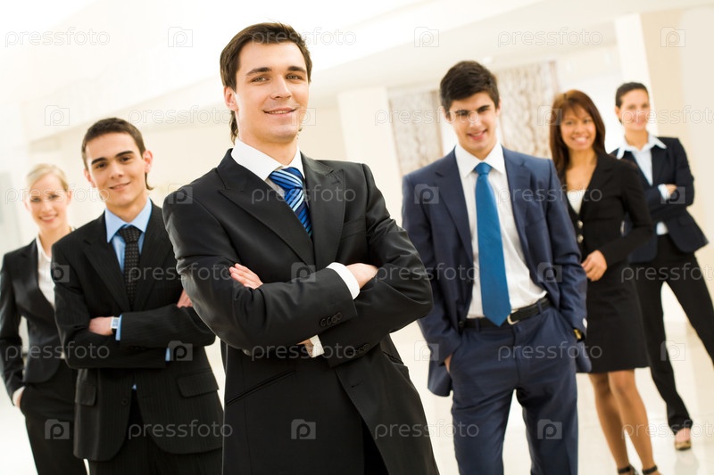 Умный бизнесмен смотрит на камеру на фоне своих дружеских партнеров
