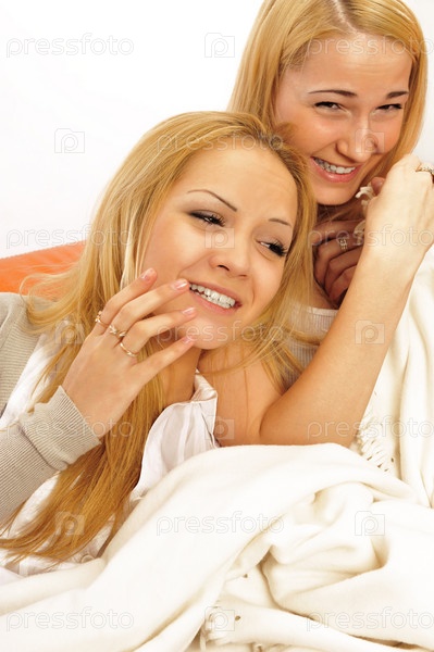 Две смеющиеся блондинки на белом фоне